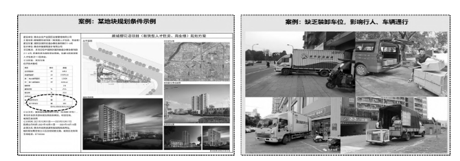 由于配建指標及地塊出讓條件中缺少裝卸泊位配置要求,配送站等地塊沿線用地結合考慮差,城市物流配送與城市交通相互干擾現(xiàn)象嚴重[3]。城市物流配送站等用地規(guī)劃及管理案例如圖3所示。
