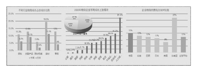 物流成本的構成通常包括保管成本、運輸成本和管理成本。雖然我國總體物流成本低于發(fā)達國家,但物流成本占產(chǎn)品成本比重較高,全社會物流費用占GDP比值高于發(fā)達國家,存在成本持續(xù)提升趨勢[4]。2020年部分行業(yè)物流成本統(tǒng)計分析如圖4所示。