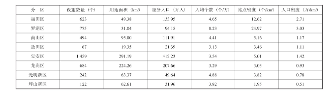 在確定配送站總體規(guī)模之后,按照服務人口規(guī)模和服務用地范圍等指標,布置配送站布局方案。單個配送站通常的服務人口規(guī)模約3~4萬人,人口密集區(qū)達6~8萬人;服務用地范圍約3平方公里。深圳市物流配送站數(shù)量統(tǒng)計參考如表2所示。