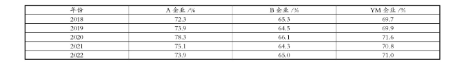 表1 A企業(yè)與B企業(yè)、YM企業(yè)采購(gòu)成本占營(yíng)業(yè)收入比率