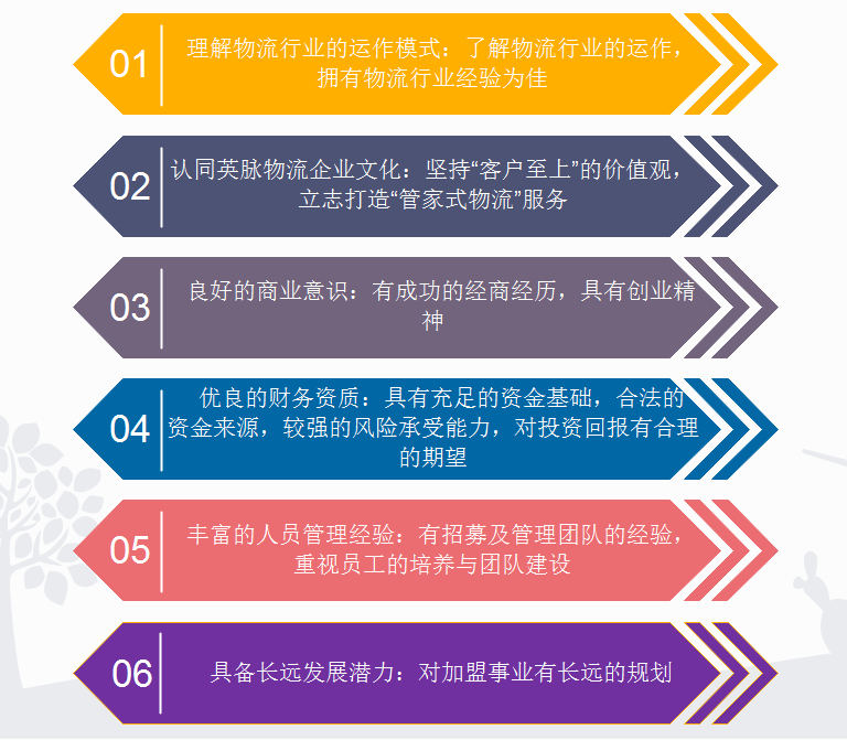 加盟商需把經(jīng)營英脈物流作為自己長期事業(yè),在通過加盟資格確認后,需要進行自行選址、籌備開業(yè)、組織車隊等工作。擁有一定的經(jīng)濟基礎與物流從業(yè)經(jīng)驗,以及遵循英脈物流的業(yè)務指導,將是您成功的關鍵。
